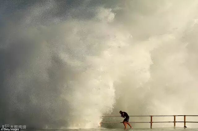 一个男人在悉尼海滨浴场紧紧抓住栏杆,面对2013年的旋风。