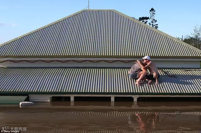 2013年,男子抱着自己的女儿在自家屋顶上躲避洪水。