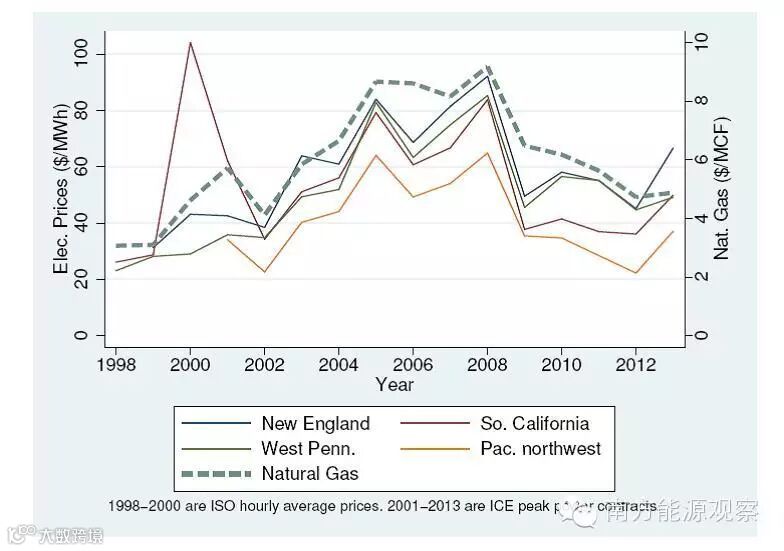 图一、美国各电力市场趸售电价波动与天然气价格波动