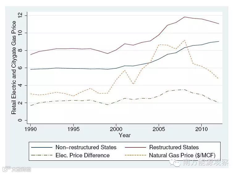 然而,售电市场与发电市场形成鲜明对比。与发电价格在电改后结构更为合理不同,销售电价并没有忠实反映发电成本。经济学家伯恩斯坦和布什奈尔通过研究指出,相同的天然气价格上涨带给电改地区的电价上涨幅度是非电改地区的两倍。需要特别指出的是,在电改地区,很多地区都推进了电力零售的竞争化。这说明,电改地区的趸售和零售竞争化没有能成功的将发电成本优势转化为价格优势。