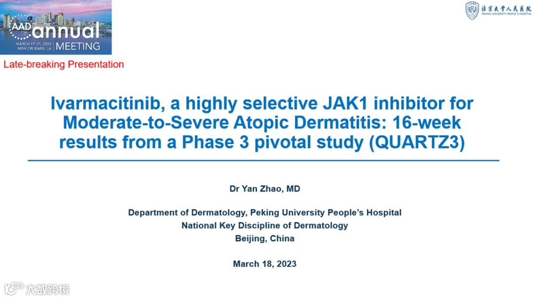作为中国唯一被邀请在Late-Breaking环节公布III期完整结果的项目,QUARTZ3是由北京大学人民医院张建中教授牵头、在全球51家研究中心开展的国际多中心临床试验,共纳入336名12岁及以上中至重度特应性皮炎受试者;这是此次临床数据首次对外公开发布。