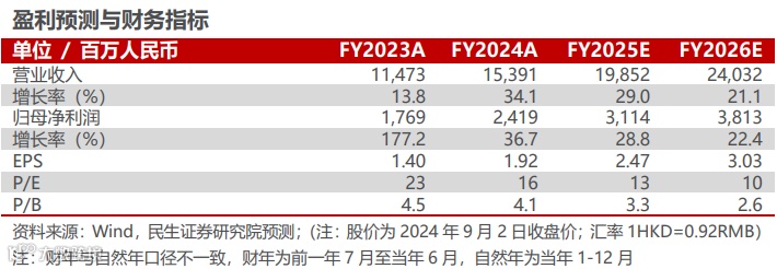 短期看,线下客流持续恢复、公司持续开店扩大业务版图,公司收入有望展现较大弹性;中长期看,“三好”产品、优质供应链、轻资产运营模式、全球化战略等竞争优势将多方位夯实公司行业龙头地位,助力公司抢占更多市场份额。我们预计2024-2026自然年公司经调整净利润分别为28.28/34.87/41.67亿元,分别同比增长20.0%/23.3%/19.5%,对应PE分别为14X/11X/10X;25-26财年归母净利润为31.14/38.13亿元,分别同比增长28.8%/22.4%,对应PE分别为13X/10X,维持“推荐”评级。