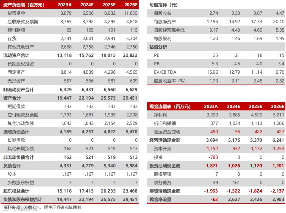毛利率稳健&期间费用率同比上行,净利率较为稳定。1)毛利率端:24Q1-Q3,毛利率为27.81%,同比+2.54 pct;24Q3,毛利率为27.01%,同比+0.54 pct,毛利率提升或系产能利用率提升&工厂效率优化等。2)费用率端:24Q1-Q3,销售费用率、管理费用率、研发费用率、财务费用率为0.35%、5.29%、1.36%、-0.36%,分别同比-0.06、+1.78、-0.24、+0.21 pct;24Q3,销售费用率、管理费用率、研发费用率、财务费用率为0.26%、5.69%、1.41%、-0.90%,分别同比-0.11、+1.32、-0.20、-0.86 pct。其中,24Q1-Q3,管理费用为9.26亿元,同比+84.66%,主要系随公司收入与净利润提升,计提的薪酬绩效增加及计提员工长期服务金。3)净利率端:24Q1-Q3,净利率为16.24%,同比+0.26 pct;24Q3,净利率为15.99%,同比-0.32 pct,净利率水平维持稳定。现金流方面,24Q1-Q3,经营活动产生的现金流净额为42.51亿元,同比+31.55%,随公司销售规模增长,销售商品收到现金增加,公司现金流状况健康良好。存货方面,24Q1-Q3,存货周转天数为63.5天,同比-5天,存货周转率同比提升。