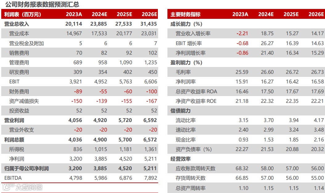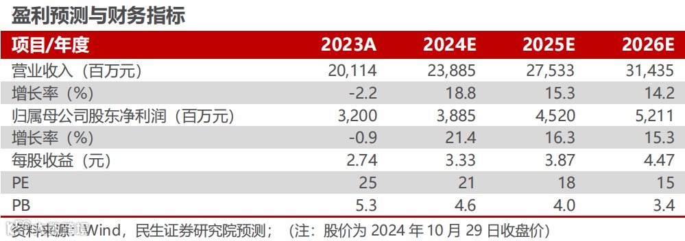 投资建议:公司生产及研发能力突出,产能扩张提供增量,预计2024-2026年公司实现营收238.85、275.33、314.35亿元,分别同比+18.8%、+15.3%、+14.2%;归母净利润分别为38.85、45.20与52.11亿元,同比+21.4%、+16.3%与+15.3%,对应PE为21/18/15倍,维持“推荐“评级。