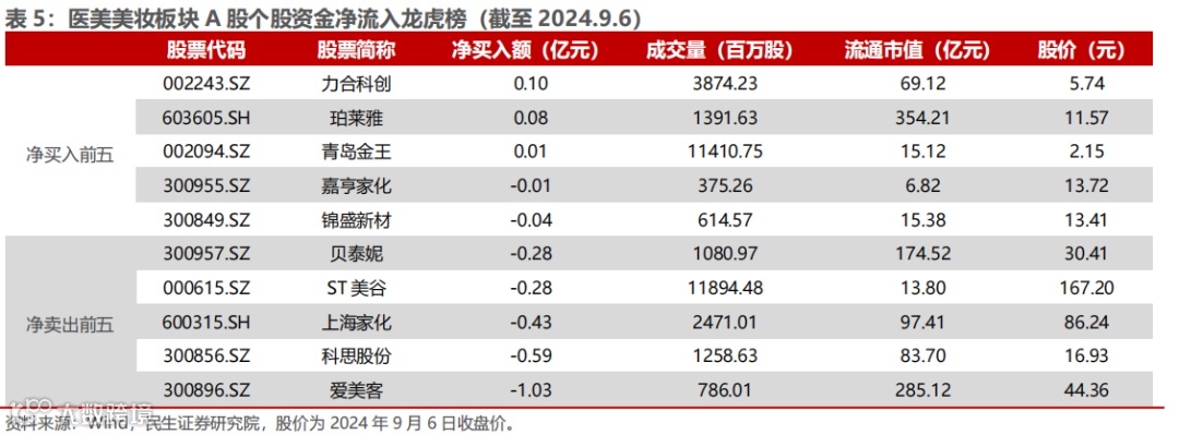 医美美妆净买入前五:力合科创(0.1亿元)、珀莱雅(0.08亿元)、青岛金王(0.01亿元)、嘉亨家化(-0.01亿元)、锦盛新材(-0.04亿元);