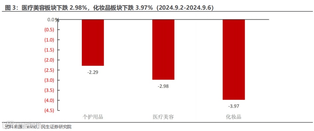 本周美容护理各细分板块:个护用品板块下跌2.29%,医疗美容板块下跌2.98%,化妆品板块下跌3.97%。