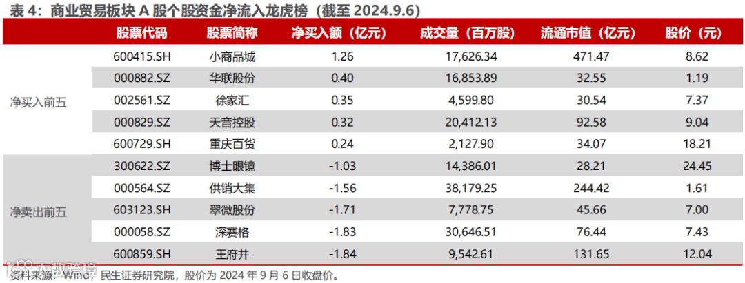 商业贸易净买入前五:小商品城(1.26亿元)、华联股份(0.4亿元)、徐家汇(0.35亿元)、天音控股(0.32亿元)、重庆百货(0.24亿元);