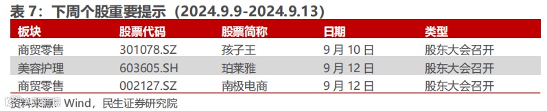 3.1 商贸零售:七月化妆品销售额经统计同比下降6.1%,相较六月环比下降39.5%;1-7月化妆品类总销售额同比增长0.3%。