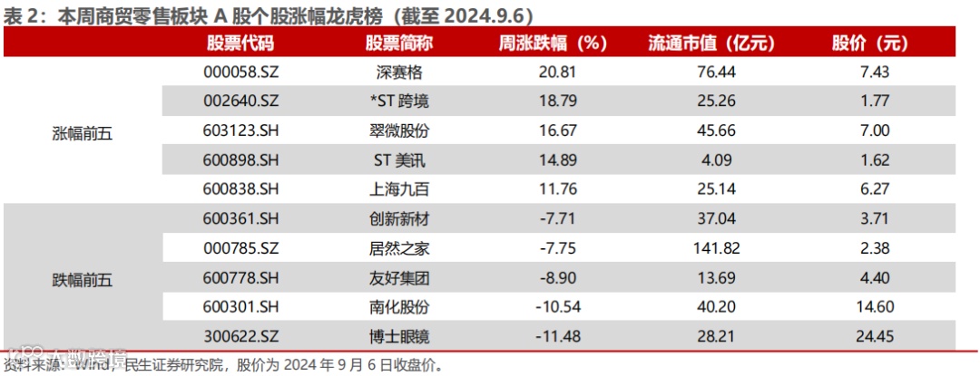 商贸零售涨幅前五:深赛格(20.81%)、*ST跨境(18.79%)、翠微股份(16.67%)、ST美讯(14.89%)、上海九百(11.76%);