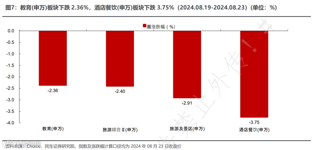 本周餐饮旅游教育各细分板块:教育(申万)板块下跌2.36%,旅游综合Ⅱ(申万)板块下跌2.40%,旅游及景区(申万)板块下跌2.91%,酒店餐饮(申万)板块下跌3.75%。