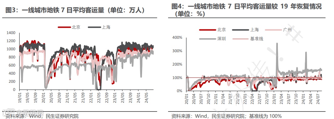 一线城市地铁客运量数据跟踪:截至2024年8月22日,一线城市北京/上海/广州/深圳七日平均客运量分别为1056/1072/884/889万人次,北京/上海/广州/深圳分别恢复至2019年同期的88%/96%/92%/155%,深圳客运量恢复趋势最为明显,北京、上海、广州七日平均客运量尚未恢复至19年同期水平。
