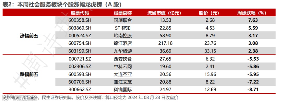 社会服务涨幅前五:国旅联合(7.63%)、ST智知(5.59%)、岭南控股(3.17%)、锦江酒店(3.08%)、九华旅游(2.38%)。