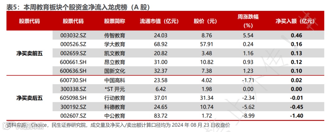 教育板块净买入前五:传智教育(+0.46 亿元)、学大教育(+0.16 亿元)、凯文教育(+0.13 亿元)、昂立教育(+0.12 亿元)、国新文化(+0.1 亿元)。