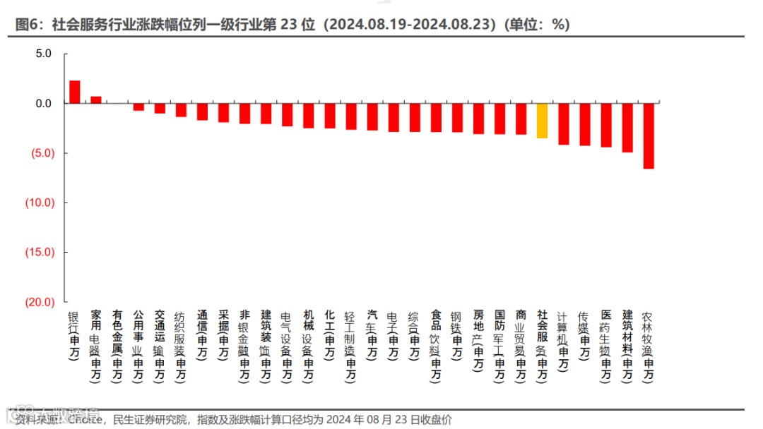 社会服务跌幅前五:西安饮食(-5.53%)、中科云网(-5.86%)、大连圣亚(-5.95%)、曲江文旅(-7.22%)、科锐国际(-8.71%)。
