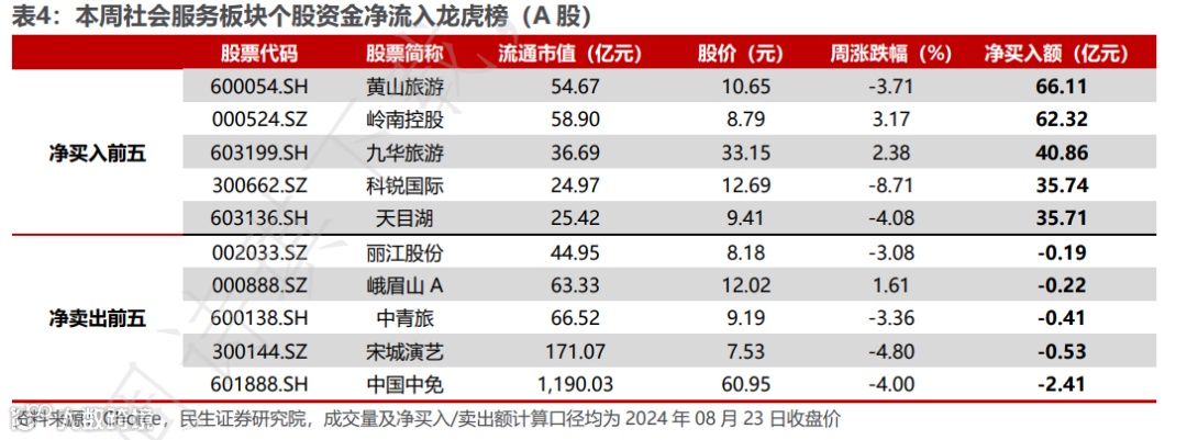 社会服务净买入前五:黄山旅游(+66.11亿元)、岭南控股(+62.32亿元)、九华旅游(+40.86亿元)、科锐国际(+35.74亿元)、天目湖(+35.71亿元)。