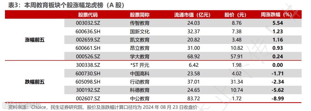 教育涨跌幅前五:传智教育(5.54%)、国新文化(1.23%)、凯文教育(1.16%)、昂立教育(0.93%)、学大教育(0.24%)。