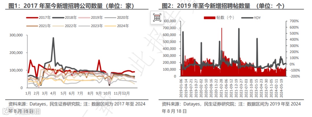 新增招聘公司数量情况:2024年8月18日为止一周,国内新增招聘公司数量44837个,恢复至23年同期的99.76%,恢复至19年同期的52.47%,新增招聘公司数量暂未复至 2019年同期水平,8月18日为止一周内国内新增招聘公司数量较8月11日为止一周减少了6.99%,较8月4日为止一周增加了1.05%,恢复速度较慢。