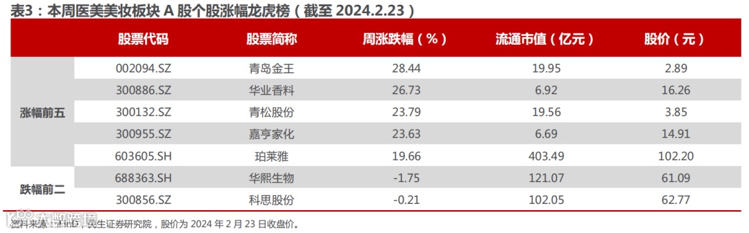 医美美妆涨幅前五:青岛金王(28.44%)、华业香料(26.73%)、青松股份(23.79%)、嘉亨家化(23.63%)、珀莱雅(19.66%);