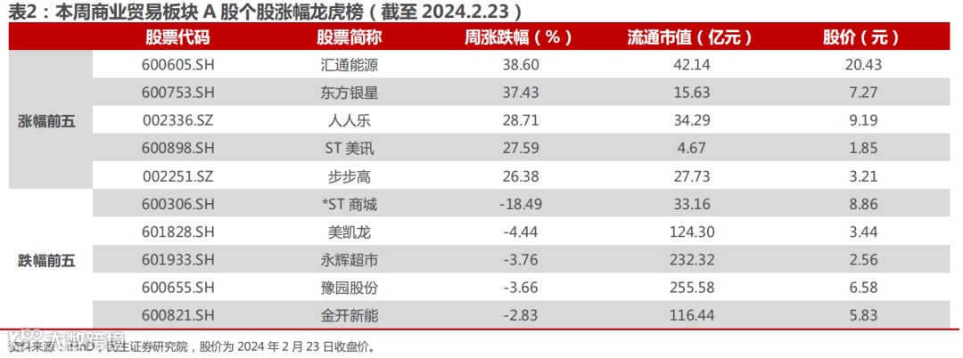 商业贸易跌幅前五:*ST商城(-18.49%)、美凯龙(-4.44%)、永辉超市(-3.76%)、豫园股份(-3.66%)、金开新能(-2.83%)。