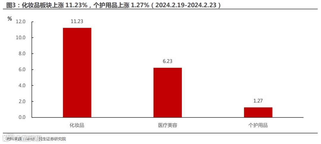 本周美容护理各细分板块:化妆品板块上涨11.23%,医疗美容板块上涨6.23%,个护用品板块上涨1.27%。