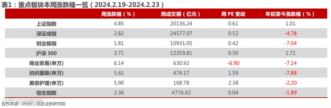 2.1.1 本周各板块涨跌幅:上证指数上涨4.85%,商贸零售上涨6.14%,纺织服装上涨5.61%,美容护理上涨5.90%