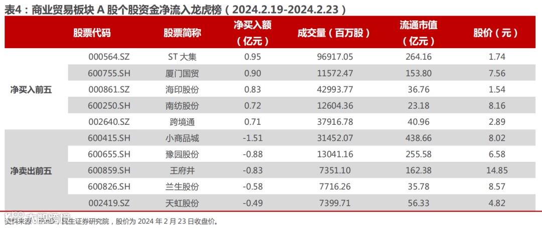 商业贸易净买入前五:ST大集(0.95亿元)、厦门国贸(0.90亿元)、海印股份(0.83亿元)、南纺股份(0.72亿元)、跨境通(0.71亿元);
