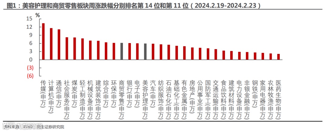 本周31个申万一级行业:美容护理板块(5.90%)和商贸零售板块(6.14%)在31个申万一级行业中分别排名第14位和第11位。本周涨幅最大的板块是传媒(13.39%),涨幅最小的板块为医药生物(2.09%)。