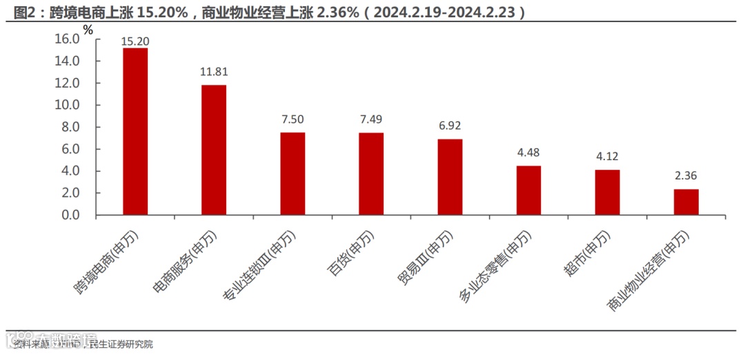 本周商贸零售各细分板块:超市板块上涨4.12%,专业连锁板块上涨7.50 %,百货板块上涨7.49%,跨境电商板块上涨15.20%,商业物业经营板块上涨2.36%,贸易板块上涨6.92%,电商服务板块上涨11.81%,多业态零售板块上涨4.48%。