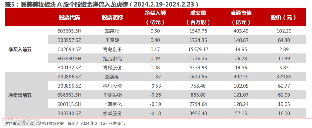 医美美妆净买入前五:珀莱雅(0.50亿元)、贝泰妮(0.40亿元)、青岛金王(0.17亿元)、拉芳家化(0.09亿元)、青松股份(0.08亿元);