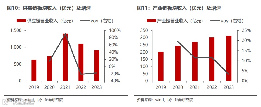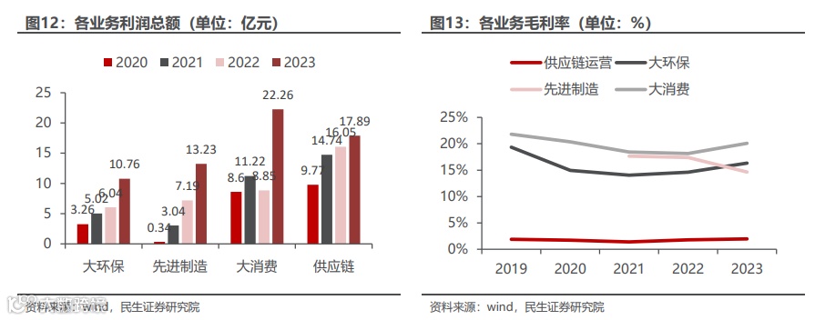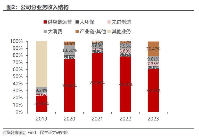 供应链贡献主要收入,产业链营收占比增加。目前供应链板块的业务是公司收入贡献最高的业务,2020-2023年的收入占比在80%左右,其收入变动将大幅影响公司整体的收入走势。产业链端,大环保业务的收入占比基本稳定,约为5%;大消费及先进制造的合计收入占比超10%,其中,先进制造的收入占比近三年持续上升,从2021年的2.02%提升至2023年的7.35%,同时,大消费业务的收入贡献总体呈下降趋势。