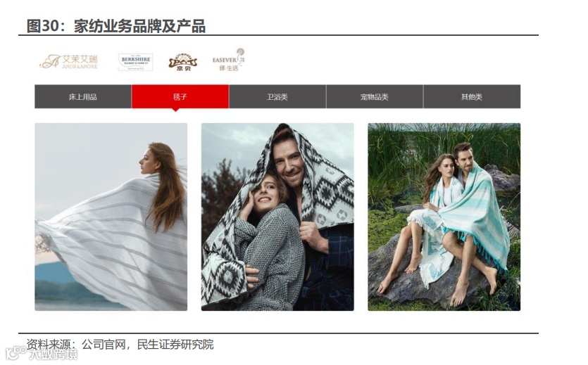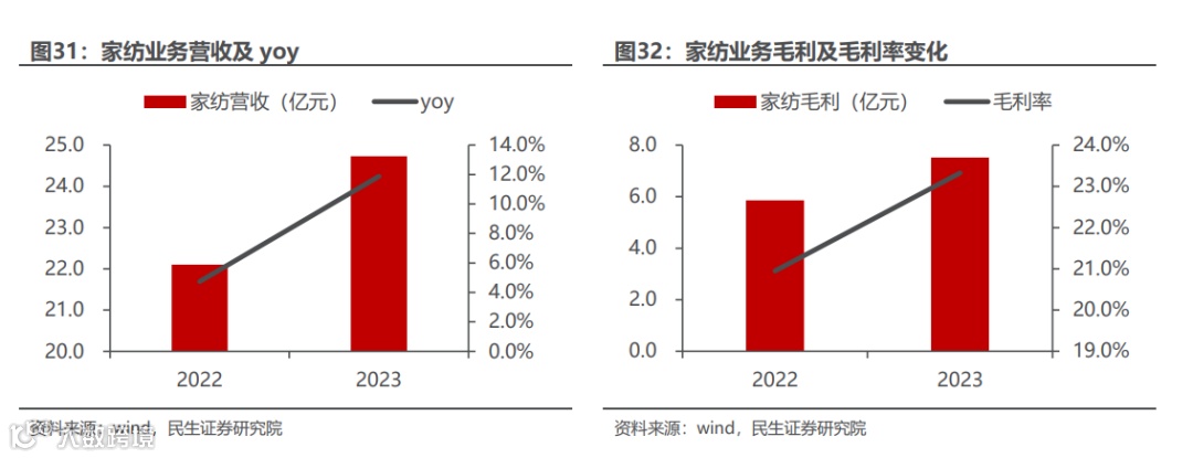 2)家用纺织品:全产业链运营模式,多个单品出口第一。14年从海外买入老牌品牌,借助其海外市场渠道来扩充自主品牌。拥有产能合理的国内工厂、渠道成熟的海外公司,形成集设计研发、实业制造、商贸服务、自主品牌建设为一体的全产业链运营模式。产品包括毯子、被子、床单件套、宠物用品等,自主品牌包括 BERKSHIRE、绎生活、京贝等。BERKSHIRE与山姆会员店持续升级合作,创新雾丝绒毯成为山姆会员店2023秋冬畅销单品。依托Berkshire Blanket&Home Co.在美国市场渠道优势、品牌优势,23年品牌营收同比增长 14%,占家纺业务营业收入比例达 52%,BERKSHIRE、NVM 销售额实现三年翻番。2023年营收24.7亿元/yoy+11.9%,占比营业收入2.01%,毛利率23.3%/+2.38pct,利润总额约 3.1 亿元,同比增长约 19%。