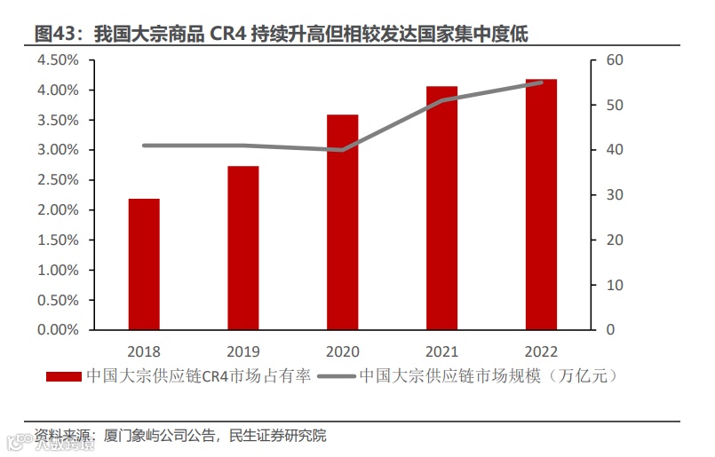 政策扶持力度加大,公司作为供应链头部企业成长空间广阔。 近年来,国家不断提高对供应链行业的重视程度,出台各类相关政策意见促进供应链行业发展。发达国家供应链市场,呈现“大市场、大公司”的特点。而我国供应链市场呈现“大市场、小公司”的特点。2021年海外大宗商品原油市场供应链CR4(嘉能可、托克、维多集团和贡渥集团)份额超20%。2015-2020年,海外农业市场供应链CR4稳定在14%左右。2018至2022年,我国大宗商品CR4集中度稳步增长,2022年达4.18%。相对于发达国家,我国大宗商品供应链行业的集中度较低,行业龙头盈利能力未来仍有较大的成长空间。