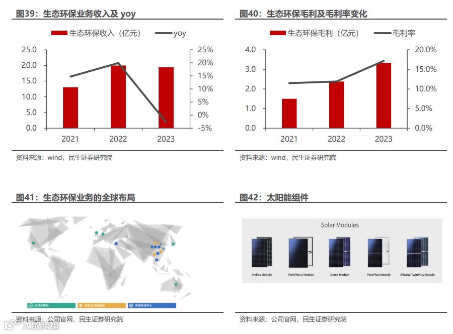 2)生态环保业务:持续巩固水处理等传统业务,大力发展固废处置、土壤修复、可降解新材料、餐厨垃圾处理等新兴业务。为客户提供项目咨询、工程设计、设备成套供应、施工建设、运营管理等全程或部分服务,已在海内外三十多个国家和地区成功建设了数百座工程项目。2023年,新签生态环保工程项目22亿元,同比增长28%。