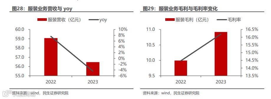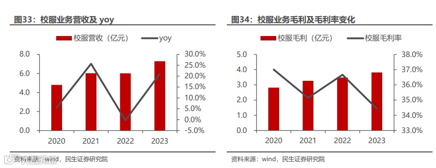 3)品牌校服:以伊顿纪德品牌运营为核心,专注国内校服行业。累计服务清华附小、复旦附中、南洋模范、重庆八中、南师附中等近 5000所学校,提供校园服饰系统解决方案。搭建线上校园生活解决方案平台“伊学团”,通过数字化方式为家长提供便利的校服增订、日常服装、以及校园日常生活产品的购买服务,有效地增加客户黏性。2023年校服实现营收7.3亿元/yoy+20.1%,占比总营收0.59%,毛利率34.4%/-2.23pct。