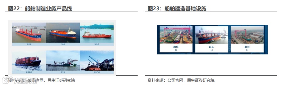 3)船舶制造与航运服务板块业务:聚焦中型船舶,强化“船舶制造+航运”协同发展模式。船舶业务聚焦中型船舶,定位于中型船舶的研发建造,巩固集“船型品牌+船型研发+船舶建造”为一体的业务模式综合竞争力。独有的”皇冠“系列散货船,声誉卓著,以优异的性能、稳定的质量和良好的节能效果,成为航运市场中的佼佼者,截至22年,近20年累计交付客户超160艘。航运板块立足打造一支绿色、高效的干散货船队,为国内外客户提供高水准的海上运输服务。2023年实现营收44.4亿元/yoy+21.74%,占比总营收3.61%,毛利率9.94%/-4.63pct。