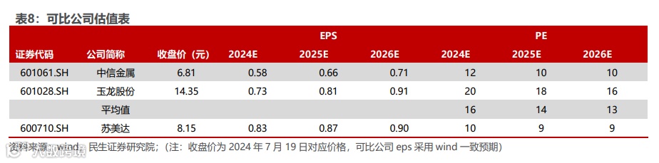 公司75%左右的业务由大宗商品贸易贡献,我们选取大宗商品贸易行业的可比公司中信金属、玉龙股份,中信金属主要从事钢铁、有色金属及相关行业的技术开发、转让、销售业务,玉龙股份主要从事矿产、有色金属、煤炭、化工等大宗商品贸易。我们采用PE估值法,24-26年可比公司平均PE为16/14/13X,公司PE为10/9/9X,低于可比公司平均值,估值具备优势。