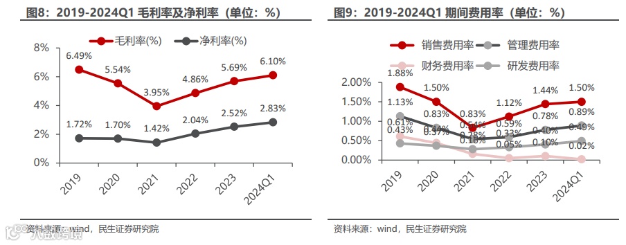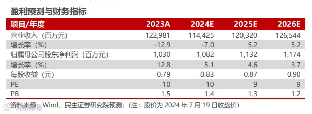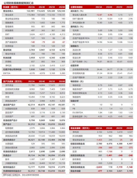 综上所述,预计公司2024-2026年实现收入1144.25/1203.20/1265.44亿元,同比变化-6.75%/+5.15%/+5.17%。毛利率分别为5.96%/5.93%/5.86%。