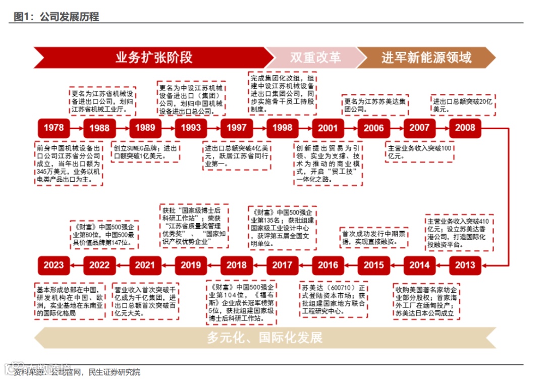 第一阶段(1978-1997):出海创汇,实施多元化扩张战略。公司系国机集团的重要成员企业,成立初期主要经营千斤顶等机电类产品出口业务,进出口总额逐年稳步升至江苏省同行业第一。1989年,公司创立SUMEC品牌,大力推进产品多元化和市场多元化战略,业务规模快速扩张。