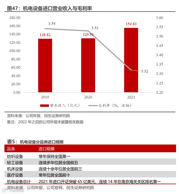 公司是全国最大的机电设备进口代理商。2019-2021年间公司机电设备进口业务营收持续增长,2021年同比增长19.51%至154.83亿元。同时业务毛利率逐年下滑,但降幅微弱,始终保持在同比变动0.5%的范围内。此外,苏美达纺织设备、轻工设备、机床设备、医疗设备进口规模均常年排名全国前列,2021年进口开证规模突破65亿美元。2022最新年报显示,机电设备进口领域的“苏美达达天下”数字化平台也在努力构建“生态圈”,已经凭借数字化实践的成功和行业影响力成为第五届进博会“数字展会平台建设运营合作伙伴”。其提供装备展示厅、融资租赁展示厅、物流平台、在线签约与购标等功能将更好地服务下游客户与上游供应商,有望辅助机电设备进口业务进一步增强。