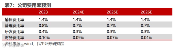 假设公司的销售费用率保持稳定,24-26年均为1.4%。管理费用率和研发费用率小幅改善,假设管理费用率24-26年均为0.7%,研发费用率24-26年均为0.3%,财务费用率24-26年分别为0.09%/0.07%/0.04%。