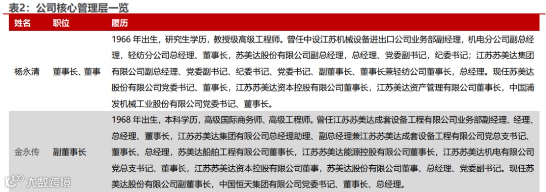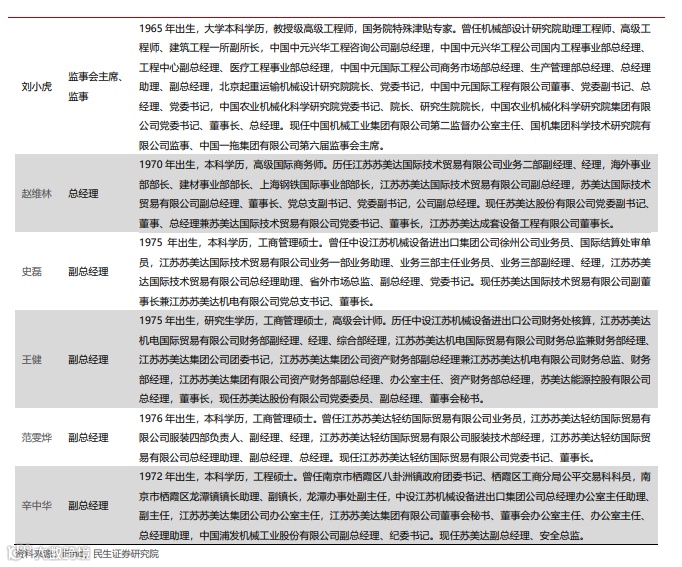管理层深耕行业多年,经验丰富。公司董事长杨永清先生曾任职于中设江苏机械设备进出口公司、机电分公司、轻纺分公司及公司,副董事长金永传先生获得高级国际商务师、高级工程师资格,监事会主席刘小虎先生获得教授级高级工程师资格,均具备丰富的从业经验。核心管理团队整体较为稳定,熟悉公司发展历程及各阶段发展情况,有助于公司长期稳定发展。