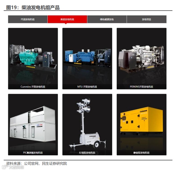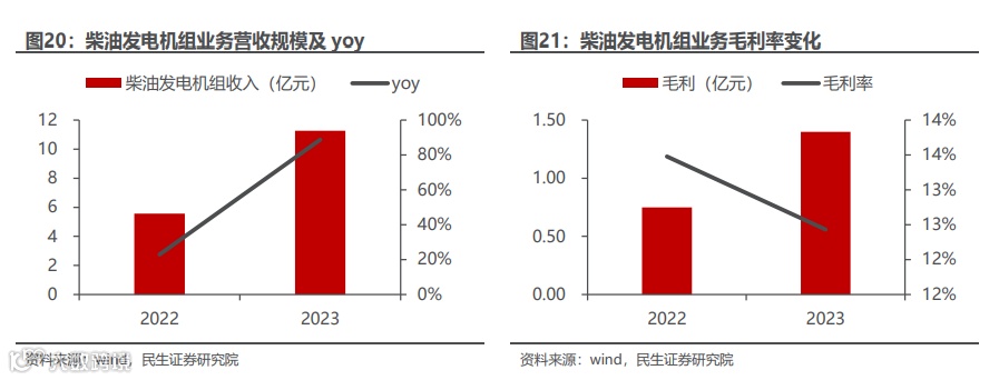 2)柴油发电机组:应用场景广泛,可用于通讯运营商、数据中心、银行、医疗健康、制造工厂、养殖基地、油田矿山、开采及项目施工现场等。根据恒州博智调研数据,2022 年国内市场规模超 300 亿元,全球柴油发电机组市场收入约 150 亿美元,目前中国占全球市场份额约为 28%。业务足迹遍布 40 多个国家,为中国移动、中国联通、微软、京东数据中心等提供发电机组及相应服务,截至22年,近20年累计完成千余个项目。紧跟国内新基建、“东数西算”及高端装备制造升级的产业趋势,23年全年共承接 10 多个省、超过 50 个地级市的各类项目。业务以出口为主,23年出口量占业务总营收的90%左右。2023年实现营收11.26亿元/yoy+88.79%,占比总营收0.92%,毛利率12.43%/-0.11pct。