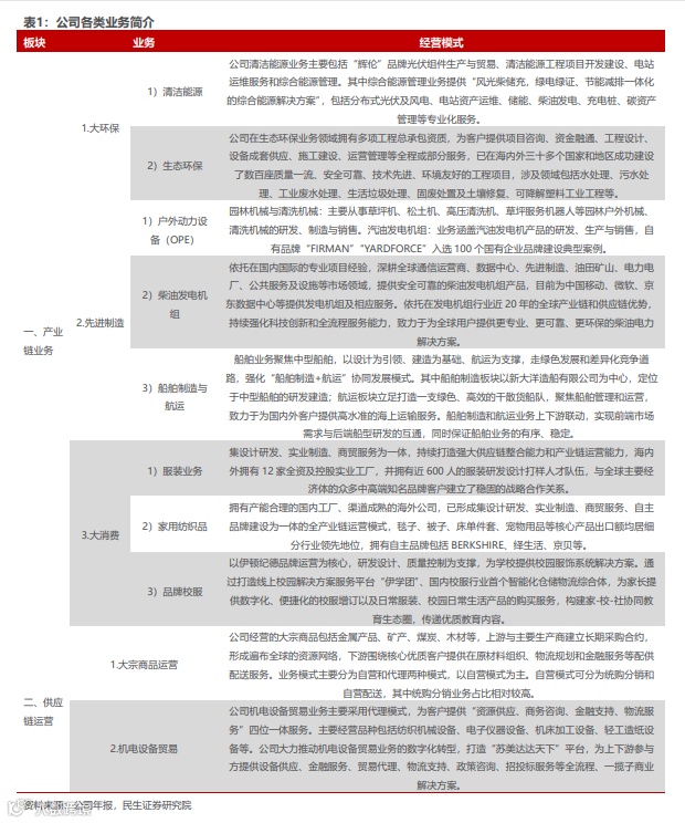 公司主营业务包括产业链和供应链两大板块。根据公司发展战略,目前聚焦发展供应链运营、大消费及先进制造、生态环保与清洁能源三类业务,培育孵化数字化产业、医疗健康两类业务。