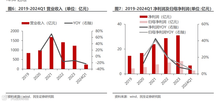 公司业绩整体稳健,净利润稳步增长。2023 年营业收入 1229.81 亿,三年归母净利润 CAGR 达 23%。收入端,2021 年公司大力拓展国内市场,同时紧抓大宗商品市场向好机遇,营业收入首次突破千亿,同比上涨 71.09%;受宏观环境对国内大宗商品需求的影响,公司收入业绩暂时承压,2022 年营收同比下降 16.33%至 1411.45 亿,2023 年同比下降 12.87%至 1229.81 亿。利润端,由于子公司实施员工持股计划,摊薄了归母净利润;2021年受益于营业收入大幅上涨和运营规模稳步提升,公司归母净利润同比增幅达40.43%,2022年公司积极优化业务与市场结构,利润稳步增长至9.16亿元,2023年归母净利润同比增长12.43%至10.30亿元。