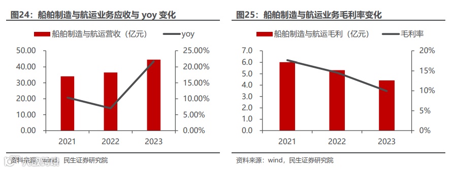 23年船舶制造与航运业务营收大幅增长。因成本上涨导致毛利下降。航运业务受俄乌冲突、能源危机、通货膨胀等多重因素扰动,全球经济显著放缓,全球海运贸易量略低于三年前水平,运价行情震荡走弱。成本端或因“绿色发展和差异化竞争”要求导致采购成本上涨。