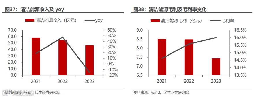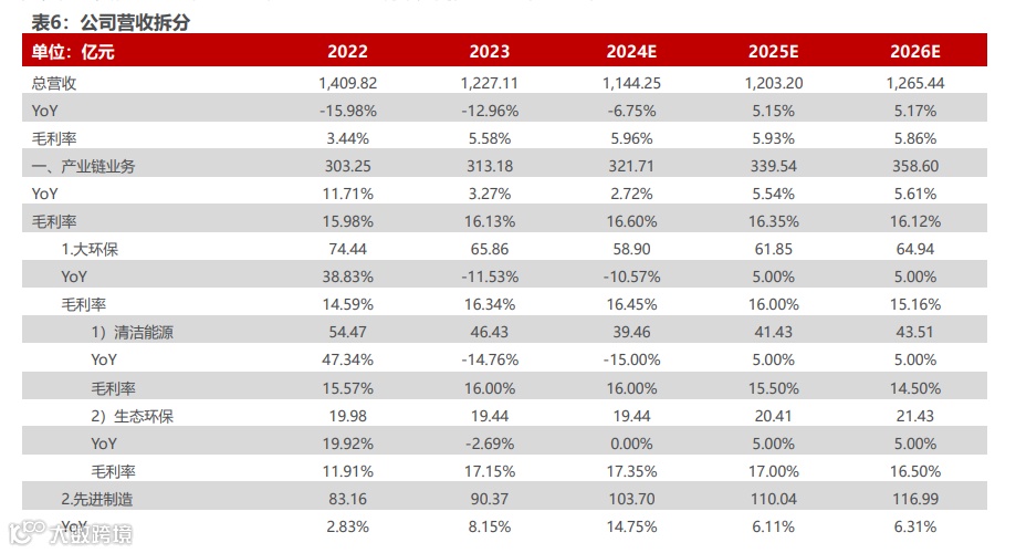 ③生态环保业务,涉及领域包括水处理、污水处理、工业废水处理、生活垃圾处理、固废处置及土壤修复、可降解塑料工业工程等。受宏观经济增长放缓、地方财政吃紧等的影响,有可能导致公共财政用于生态环保的支出增长放缓。因此预计2024-2026年分别实现收入19.44/20.41/21.43亿元,同比变化0.00%/+5.00%/+5.00%。假设24-26年毛利率与23年比略有下降,24-26年分别为17.35%/17.00%/16.50%。