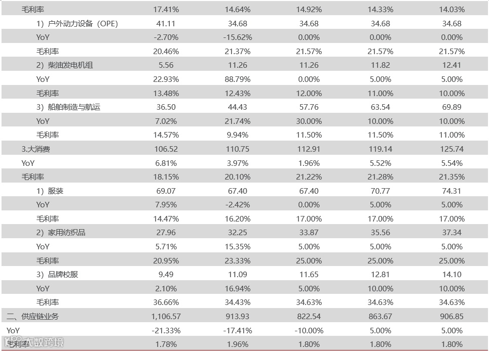 ⑦服装,海内外拥有12家全资实业工厂和5家控股实业工厂,并拥有近600多人的服装研发设计打样人才队伍。发达国家服装行业周期的去库存阶段基本结束,正在进入补库存阶段。预计2024-2026年实现收入67.40/70.77/74.31亿元,分别同比0.00%/+5.00%/+5.00%。由于海外进入补库阶段,假设需求上升,假设24-26年毛利率均为17.00%。