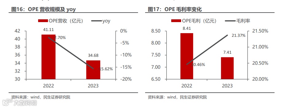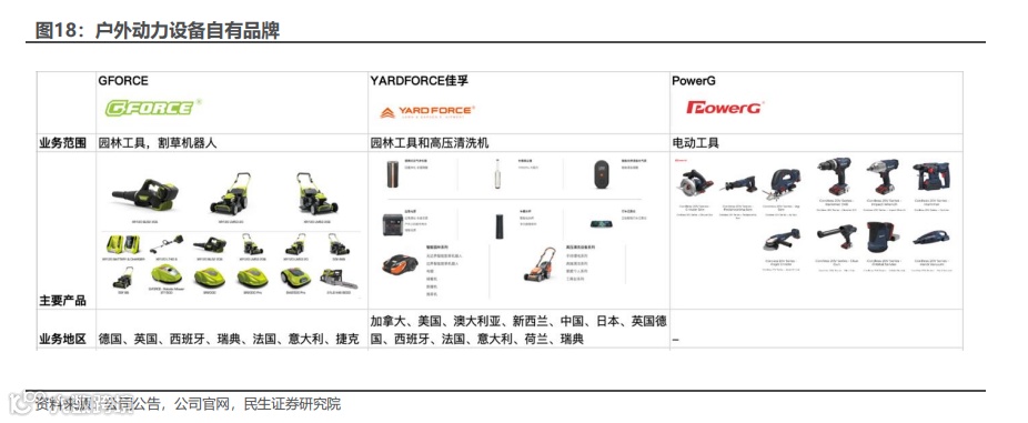 1)户外动力设备:自主研发和制造,开展跨国的营销、研发和售后,合作方广泛多样。产品主要包括草坪服务机器人及割草机、松土机、电动锯、修枝剪等使用小型电机或者发动机的设备及汽油发电机。公司产品主要出口国外,其中欧洲约占65%,美国约占20%,其余出口到日本和南美。OPE产品主要消费终端需求较为刚性,行业具备稳定的市场空间,同时受库存周期、地产周期影响较大。2023 年受美元加息、头部零售商去库存等影响,OPE行业整体较为低迷。根据 Global Market Insights 的统计数据,2018 年全球草坪和园林设备市场规模为283 亿美元,2023年为近400亿美元规模,预计至 2025 年有望超过 450 亿美元,年复合增长率接近 7%。汽油发电机组市场较为稳定,规模维持在10-20亿美元/年,北美及非洲等区域是传统主要销售区域,共占据45%的市场规模。2023年实现收入34.68亿元/yoy-15.62%,占比总营收2.82%,毛利率21.37%/+0.91pct。