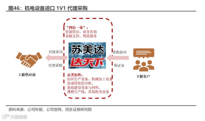 业务模式方面,代理机制为框架,设备采购为核心,“四位一体”打造综合服务能力。公司机电设备贸易业务运作时,公司首先获取下游客户的采购意向,由此代理客户从上游供应商采购商品。在采购过程中,公司将根据商品价格的波动及时调整收取的保证金,以对冲价格波动带来的经营风险,最终实现下游客户与上游供应商的一对一匹配。打造了“苏美达达天下”平台,依托公司多年来积累的业务支撑能力和互联网信息手段,实现资源与信息的交互、上下游间的产业协同,为每位客户提供“资源供应、商务咨询、金融支持、物流服务”四位一体的商业解决方案。