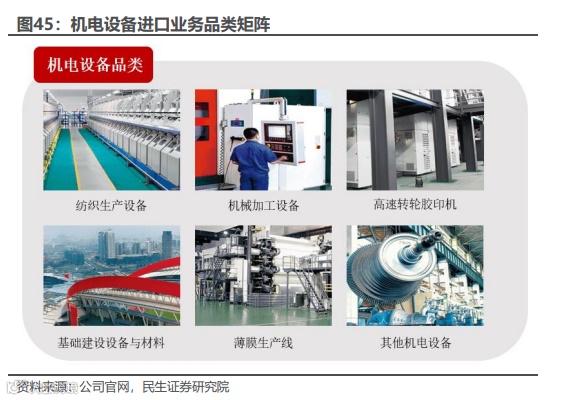 公司的机电设备进口业务打造了丰富的品类矩阵,主要包括纺织生产设备、机械加工设备、高速转轮胶印机、基础建设设备与材料、薄膜生产线、其他机电设备六大内容,在经营范围和设备性质方面可进一步细分为各类机电设备的国际国内招标、纺织设备进口、机械加工装备引进、轻工设备引进、通讯电子设备引进、医疗设备进口、新能源设备引进、冶金设备及技术引进、工程机械引进、重大项目及基础建设设备引进等。